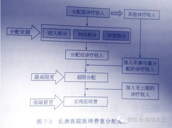 长庚医院在建院不久就引入美国的“医师费(PF)制度”,即不管医院经营业绩如何,主治医师在提供每项医疗服务后,均由医院拨付事先洽定比例的金额金额作为主治医师酬劳。在此基础上,长庚医院设计了重分配制度、保障薪、最高限额、超限基金等相应薪酬绩效制度。